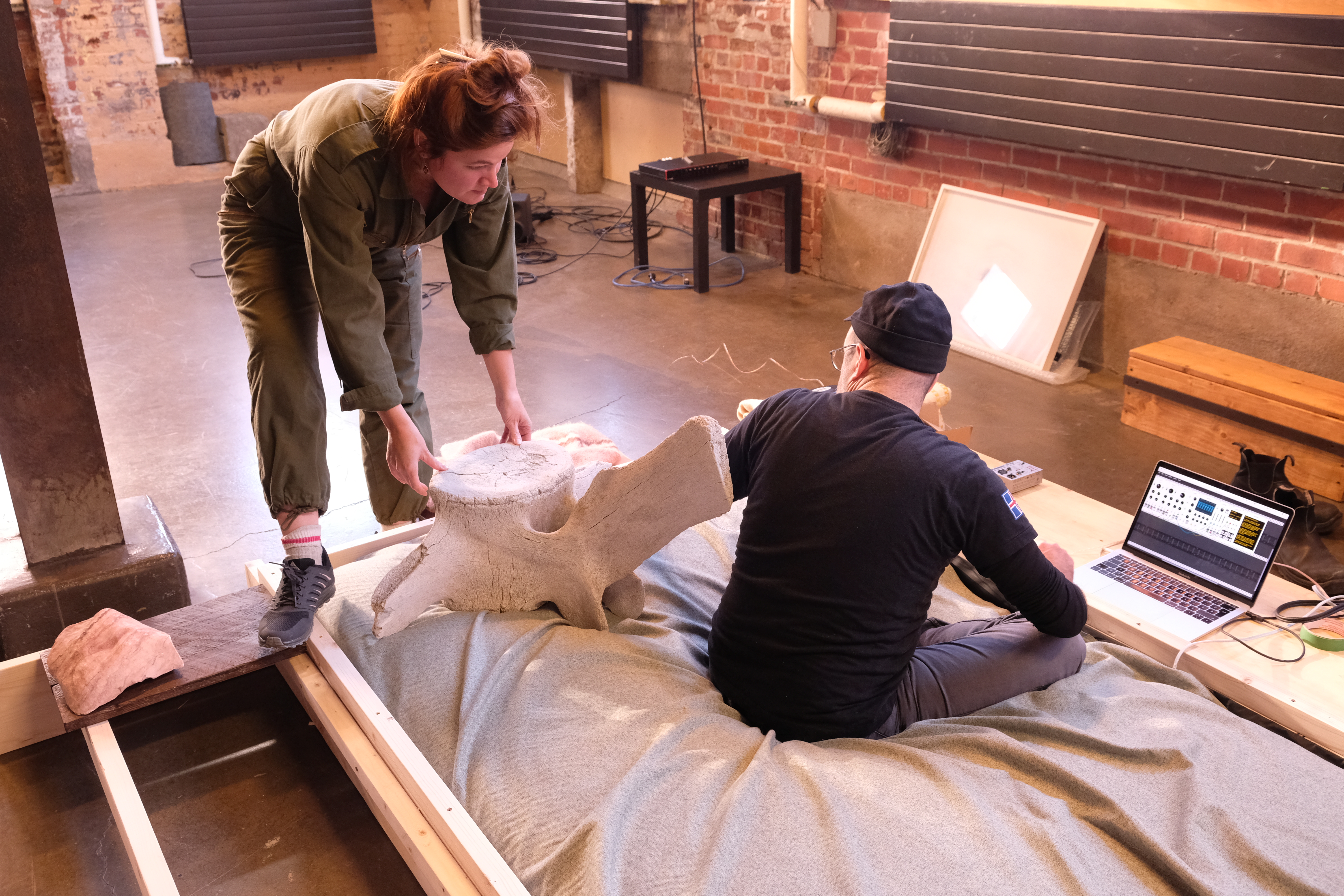 Various sound experiments involving living creatures combine sounds recorded underwater in the Arctic, those of beluga whales, for a tactile audio experience in the heart of a water bed. The bed has been modified so that you can feel the sound vibrations of a cargo ship as ifyou were pressed against the skin of a whale. A circle of speakers sculpts the sound of water in a workshop space where two little geese named Polie and Funny experience their first sonic encounter with water.